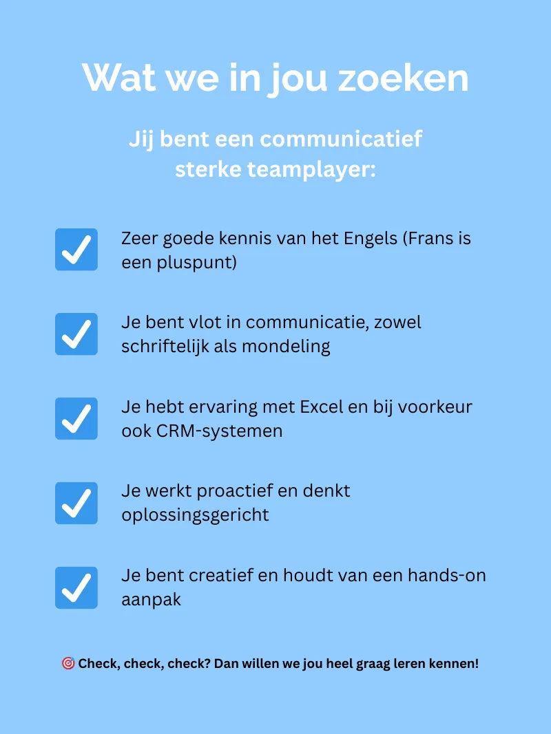 We verwachten dat je al enige ervaring hebt, bij voorkeur in de FMCG-sector (Fast Moving Consumer Goods) of in een gelijkaardige administratieve of commerciële functie. Ook een goede kennis van Excel is belangrijk.